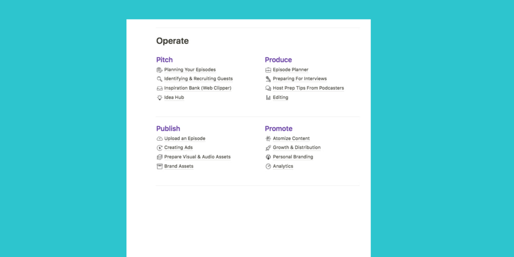 A comprehensive Notion dashboard that helps podcasters pitch, produce, publish, promote & monetize their podcasts.